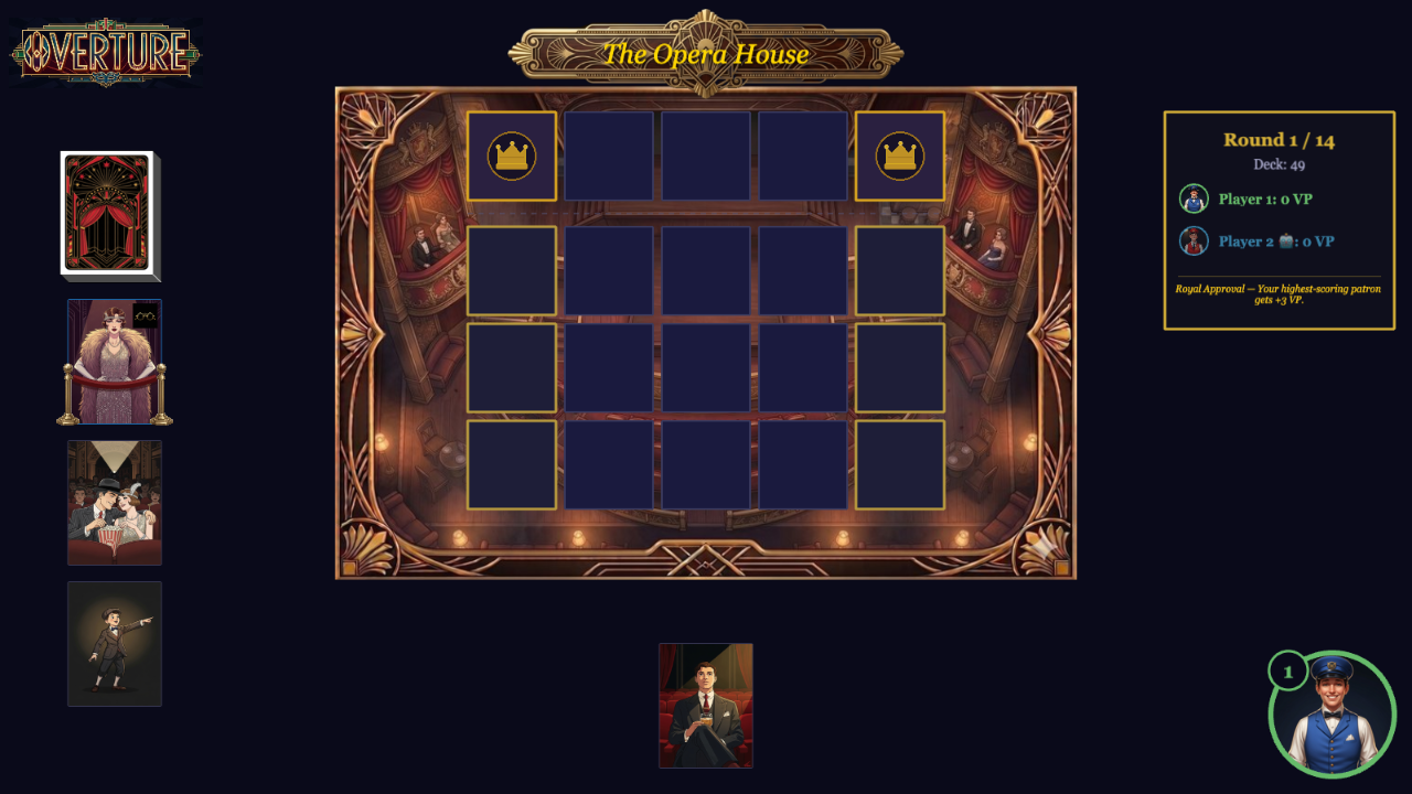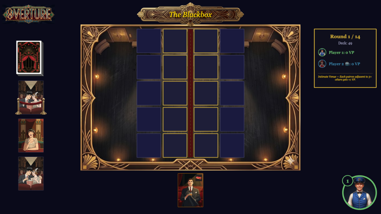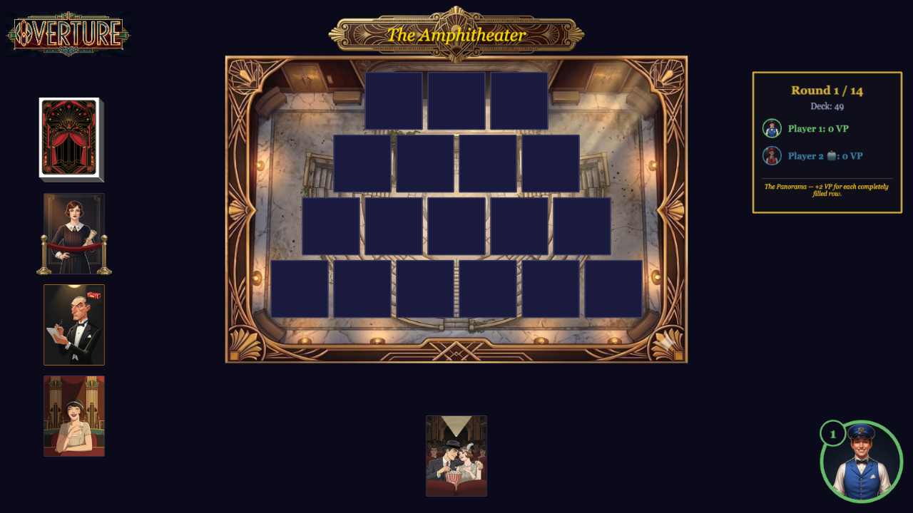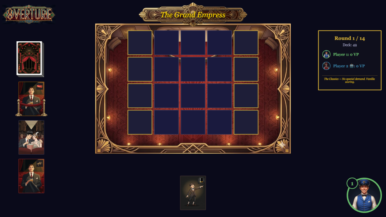 - Score: The curtains open when the deck is empty. Most Victory Points wins!